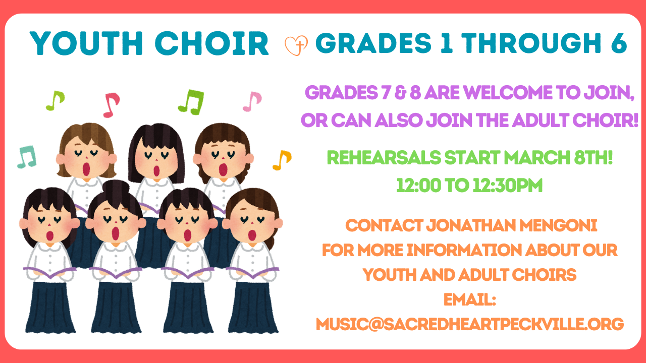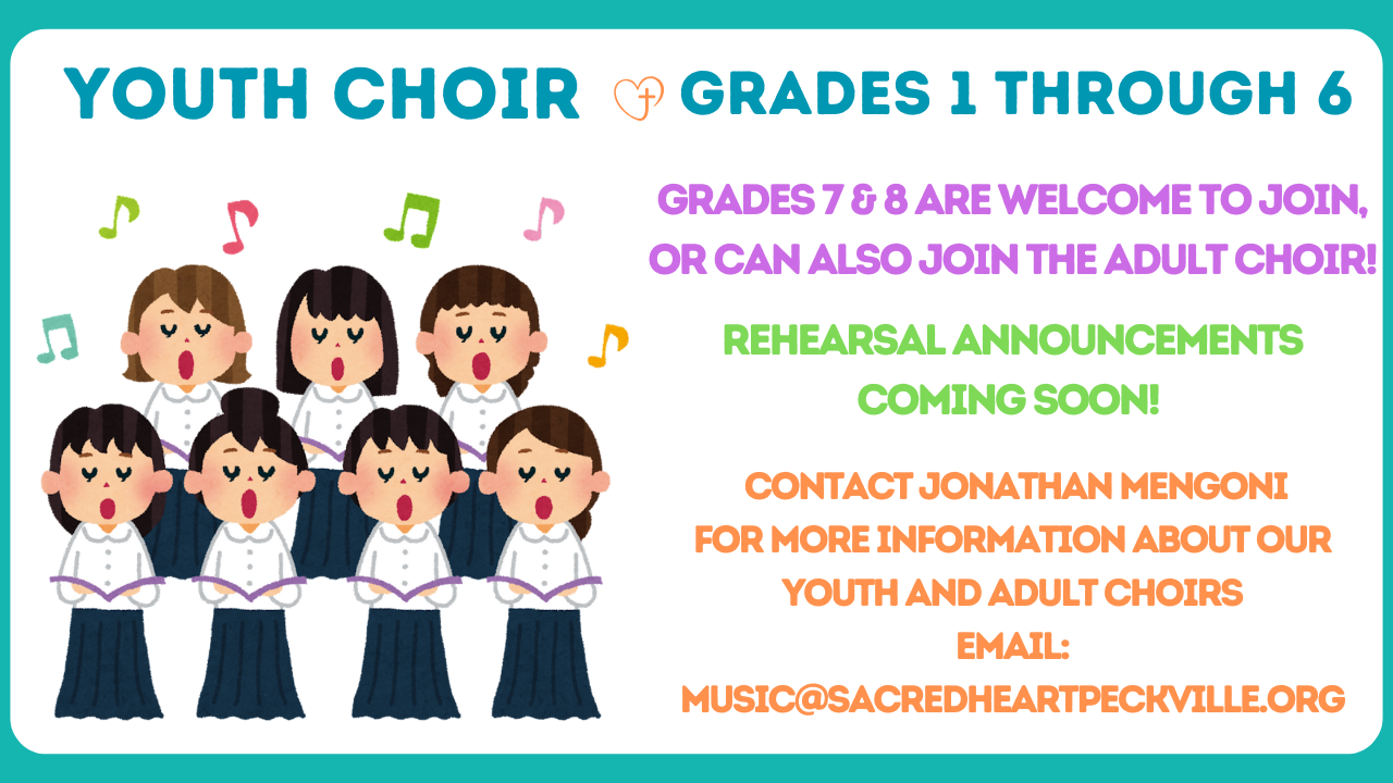 Want to find out more about our Youth and Adult Choirs? Send us an email to music@sacredheartpeckville.org More information regarding rehearsals coming soon!